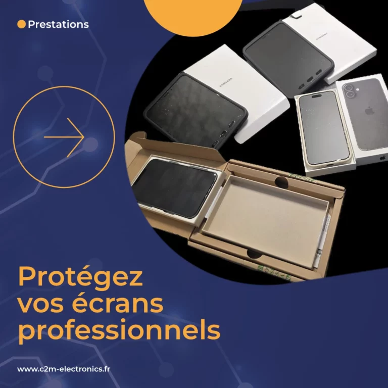 Protections d'écran pour smartphone, tablette, pupitres de machines industrielles, consoles robots, lecteurs TPE, ... Nous proposons la pose de protections d'écrans pour vos flottes et vos équipements professionnels.